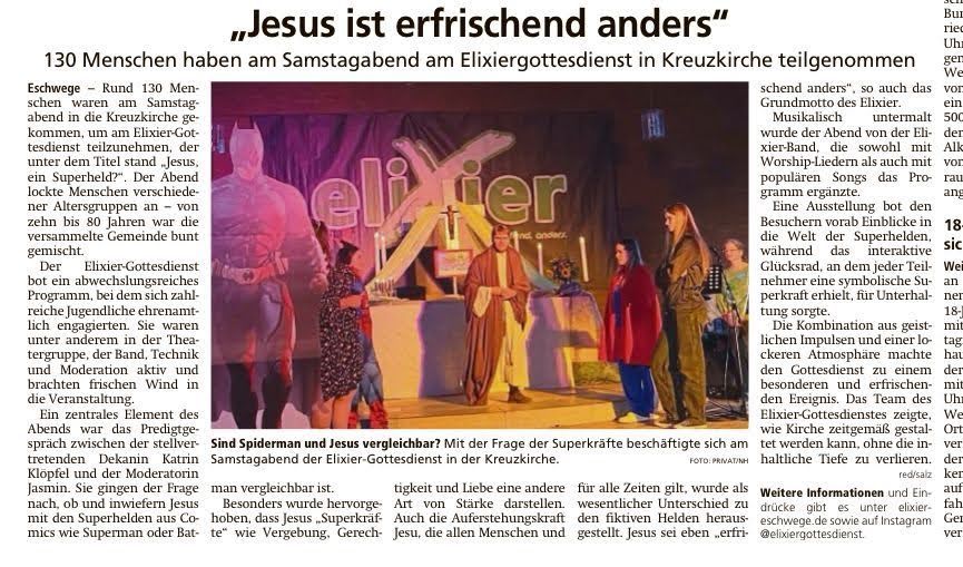 Elixier-Gottesdienst 21.09.2024, 19.00 Uhr, Kreuzkirche Jesus, ein Superheld? In einer Welt, die an manchen Tagen vor schlechten Nachrichten über Leid, Gewalt und Terror dunkel ist, brauchen die Menschen jemanden, der das Böse bekämpft und ihnen die Last nimmt. Es ist kein Vogel, es ist kein Flugzeug, es ist… Jesus Christus? Sein Leben, seine Lehren, der Tod am Kreuz und seine Auferstehung gelten für uns Christen als zentrale Inhalte des Glaubens. Man könnte beinahe meinen, er sei ein Superheld, wie er in diversen Comics zu finden ist. Aber war Jesus ein Superheld? Lässt er sich in einem Atemzug mit Superman, Batman oder Thor nennen, oder ist er doch ganz anders als die Helden, die heute auf den Kinoleinwänden bejubelt werden? Mit diesen Fragen möchte sich der eliXier-Gottesdienst am Samstag, den 21.09.2024, um 19 Uhr in der Kreuzkirche in Eschwege beschäftigen. Unterstützt wird das eliXier-Team dieses Mal von der stellvertretenden Dekanin Katrin Klöpfel. Wie gewohnt, können sich die BesucherInnen auf einen Gottesdienst freuen, der in seiner Gestaltung erfrischend anders ist. Es wird bunt werden und auch wieder ein wenig lustig und unbeschwert. Auch die eliXier-Band wird den Abend sowohl mit bekannten Worship-Liedern als auch welchen aus dem Bereich der Popularmusik begleiten. Um keine Informationen für den kommenden eliXier zu verpassen und auch um sich auf den Abend einzustimmen, besucht doch gerne die Homepage www. elixier-eschwege.de oder das Instagram-Profil @elixiergottesdienst